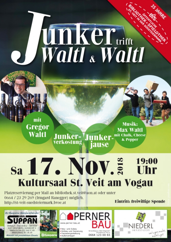 Nebenbei gibt es Junker von allen heimischen Weinbaubetrieben zu verkosten und man kann sich auch mit einer Junkerjause stärken. Platzreservierung per Mail an bibliothek.st.veit@aon.at oder unter 0664 / 23 29 269 (Irmgard Ranegger) möglich.